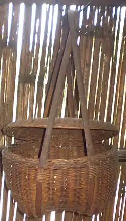 When the Nùng moved into Vietnam from Guangxi during the 12th and 13th centuries, they developed slash-and-burn agriculture and worked on terraced hillsides, tending rice paddies and using water wheels for irrigation. The Nùng engage in similar forms of agriculture today, using their gardens to grow a variety of vegetables, corn, peanuts, and fruits such as tangerines, persimmons, anise and other spices, and bamboo as cash crops.[56] Nùng material culture is similar to other highlanders. They live on higher elevation with houses built with clay on stilts near rivers to avoid flooding. Like the Tày, they are known for silversmithing, weaving, basketry, papermaking, and embroidery. Indigo, which represents faithfulness, is a popular choice of color for clothing. Typical motifs for embroidery are the sun, flowers, and stars.[57]