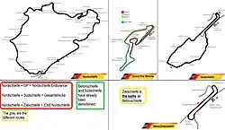 Originally, the track featured four configurations, namely the 28.265 km (17.563 mi)-long Gesamtstrecke,[b] which in turn consisted of the then-22.835 km (14.189 mi) Nordschleife,[a] and the 7.747 km (4.814 mi) Südschleife.[c] There was also a 2.281 km (1.417 mi) warm-up loop called Zielschleife,[d] or Betonschleife,[e] around the pit area.[3] Between 1982 and 1983, the start–finish area was demolished to create a new GP-Strecke,[f] which is now used for all major and international racing events. However, the shortened Nordschleife is still in use for racing, testing and public access.[4]