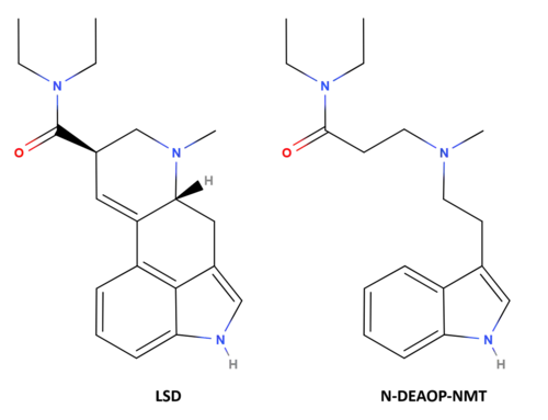 N-(3-Diethylamino-3-oxopropyl)-N-methyltryptamine (N-DEAOP-NMT) is a tryptamine derivative and a "partial" or simplified ergoline which is closely related to the highly potent serotonergic psychedelic lysergic acid diethylamide (LSD).[1][2][3][4] It is the analogue of LSD in which two of LSD's carbon atoms in the ergoline ring, those at positions 9 and 10, have been removed.[1][2][3][4] This in turn renders the N-DEAOP-NMT molecule flexible and makes it a non-rigid tryptamine rather than an ergoline.[1][2][3][4] The compound is pharmacologically active, as are a number of its analogues and derivatives, with activities of the compounds including serotonin 5-HT2A receptor agonism and LSD- or hallucinogen-like effects.[1][2][3][4]