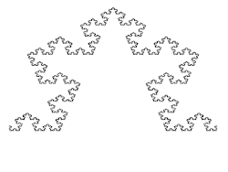 A pentaflake, or sierpinski pentagon, is formed by successive flakes of six regular pentagons.[3] Each flake is formed by placing a pentagon in each corner and one in the center. Its Hausdorff dimension is equal to ≈ 1.8617, where (golden ratio). The is obtained because each iteration has 6 pentagons that are scaled by . The boundary of a pentaflake is the Koch curve of 72 degrees.