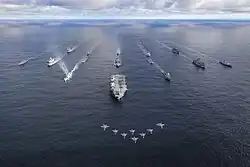 The September 11 attacks in the United States caused NATO to invoke Article 5 of the NATO Charter for the first time in the organization's history.[63] The Article states that an attack on any member shall be considered to be an attack on all. The invocation was confirmed on 4 October 2001 when NATO determined that the attacks were indeed eligible under the terms of the North Atlantic Treaty.[64] The eight official actions taken by NATO in response to the attacks included Operation Eagle Assist and Operation Active Endeavour, a naval operation in the Mediterranean Sea designed to prevent the movement of terrorists or weapons of mass destruction, and to enhance the security of shipping in general, which began on 4 October 2001.[45]