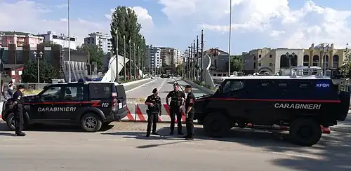 Milošević finally accepted the terms of an international peace plan on 3 June 1999, ending the Kosovo War. On 11 June, Milošević further accepted UN resolution 1244, under the mandate of which NATO then helped establish the KFOR peacekeeping force. Nearly one million refugees had fled Kosovo, and part of KFOR's mandate was to protect the humanitarian missions, in addition to deterring violence.[60] In August–September 2001, the alliance also mounted Operation Essential Harvest, a mission disarming ethnic Albanian militias in the Republic of Macedonia.[61] As of 2023, around 4,500 KFOR soldiers, representing 27 countries, continue to operate in the area.[62]