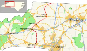 North Carolina Highway 18 (NC 18) is a primary state highway in the U.S. state of North Carolina. Traveling north–south through the Foothills region, it connects the cities of Shelby, Morganton, Lenoir, Wilkesboro and North Wilkesboro.