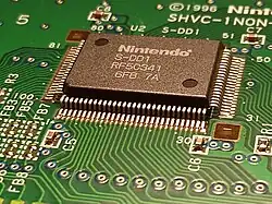This series of fixed-point digital signal processor chips provides fast vector-based calculations, bitmap conversions, 2D and 3D coordinate transformations, and other functions.[7] The chip has four revisions, each physically identical but with different microcode. The DSP-1 version, including the later 1A die shrink and 1B bug fix revisions, was most often used; the DSP-2, DSP-3, and DSP-4 were used in only one game each.[8] All of them are based on the NEC μPD77C25 CPU and clocked at 7.6 MHz.[4][9]