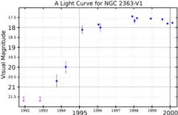 NGC 2363-V1 is a luminous blue variable star in the star-forming region NGC 2363, at the far southwestern part of the irregular galaxy NGC 2366 in the constellation Camelopardalis, near the north celestial pole nearly 11 million light years away from our galaxy. It was discovered in 1996 by Laurent Drissen, Jean-René Roy, and Carmelle Robert while examining images taken by the Hubble Space Telescope Wide Field Planetary Camera 2.[1]
