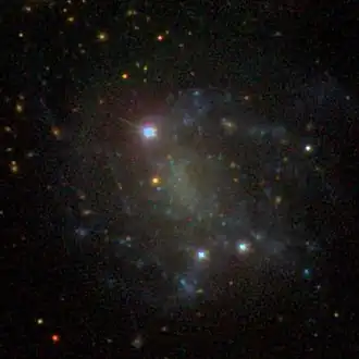 NGC 4523 is a Magellanic spiral galaxy located about 35 to 50 million light-years away[3] in the constellation Coma Berenices.[4] It was discovered by astronomer Heinrich d'Arrest on April 19, 1865.[5] NGC 4523 is a member of the Virgo Cluster.[6][7] A distance of (13 ± 2 Mpc) for NGC 4523 was derived from using yellow supergiants in the galaxy as standard candles.[6]
