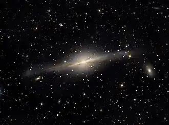 NGC 5084 is a lenticular galaxy in the constellation of Virgo. It is located at a distance of about 80 million light years from Earth, which, given its apparent dimensions, means that NGC 5084 is at least 200,000 light years across. It is one of the largest and most massive galaxies in the Virgo Supercluster. William Herschel discovered it on March 10, 1785. It is a member of the NGC 5084 Group of galaxies, which is a member of the Virgo II Groups, a series of galaxies and galaxy clusters strung out from the southern edge of the Virgo Supercluster.[4] The galaxy is seen nearly edge-on, with inclination 86°, and features a warped disk and large quantities of HI gas extending along the disk, probably accumulated after multiple accretions of smaller galaxies.[5]