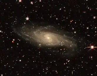 The plane of the galactic disk is inclined at an angle of 68° to the line of sight from the Earth.[4] The galaxy has a faint bar which near its ends, were the spiral arms begin, has ansae. The galaxy has two spiral arms which can be followed for more than 180 degrees. The arms are patchy and fragmented[5] and feature small star forming areas visible in H alpha. There is also H alpha emission from the nucleus.[6] In near infrared the bulge appears more pronounced and the outer arms have low surface brightness.[5]