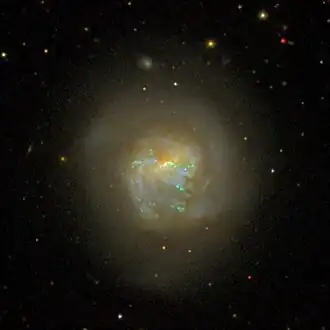 NGC 5713 is a peculiar, asymmetric galaxy in the constellation Virgo. Although classified as a spiral galaxy by most galaxy catalogs, NGC 5713 is very different from most normal spiral galaxies. While most spiral galaxies either have either two well-defined spiral arms or a filamentary spiral-like structure, this spiral galaxy has only one visible spiral arm in its disk.[2] This makes it a galaxy of the Magellanic type. Gravitational interactions with the nearby spiral galaxy NGC 5719[3] may be responsible for producing the disturbed, asymmetric structure including the single spiral arm.