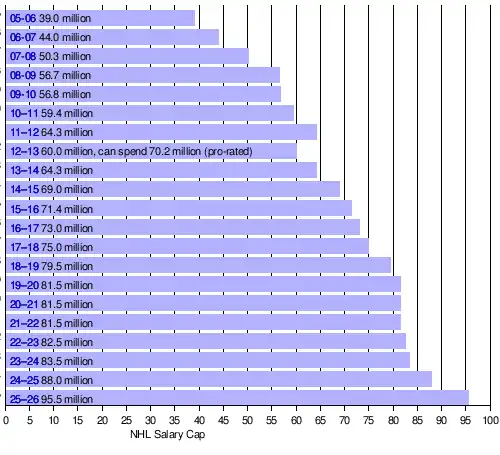 Since the NHL salary cap was reintroduced following the ratification of the current collective bargaining agreement, it has risen almost every year. The lower limit is set at 85% of the midpoint, while the upper limit (i.e. the salary cap) is accordingly set at 115% of the midpoint.[26]