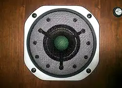 The tweeter is a beryllium deep dome design with a diffuser ring and protective wire net. It operates the frequencies 6 kHz to 20 kHz (and capable of much higher). The dome size is 3 cm (1-3/16") and it weighs only 0.028 grams. Similar to the midrange but smaller, it also has a tangential surround made of cloth coated with resins. The magnet is 18,800 Gauss and 34,000 Maxwell. The frame is diecast aluminum.