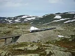 The first of the B-series trains were delivered for trial runs on 7 March 2001.[49] In May, NSB stated that they would never be able to operate the trains with the speeds they had previously stated they could, and that at least for the next year, the tilting trains would operate at the same speeds as conventional trains.[50] On 17 September 2001, the trains were put into service on the Bergen Line between Oslo and Bergen.[51] During the following winter, the trains had problems running through snowdrift unless they were running at a sufficiently high speed. Because part of the Bergen Line had frost heave, trains were forced to drive extra slowly, causing trains to get stuck. NSB stated that tests had shown that Class 73 was better able to do this than El 16, which had previously been the main locomotive on the line, although Class 73 did not do as well as the modern El 18.[52] In January 2002, NSB started rebuilding the A-series trains with a larger baggage compartment. This was largely because of insufficient space for passengers to take skis with them.[53]