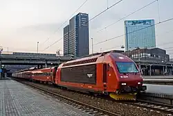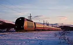 During the early 1990s, NSB was in need of new electric haulage for their passenger trains, as both classes El 11 and El 13 were in need of replacement.[1][2] El 17, the latest purchase, had proved unreliable, and NSB wanted to remove them from mainline service.[3] In 1993, Re 460 and EuroSprinter locomotives were tested in Norway, with the Re 460 being tested from 28 August through 8 October. NSB was satisfied with both units, and stated that it would be possible to increase the train weight on the intercity services from 700 to 800 t (690 to 790 long tons; 770 to 880 short tons). During the first half of 1994, NSB leased two Re 460s to have sufficient locomotives for operation during the 1994 Winter Olympics.[4][5]