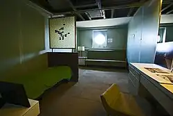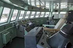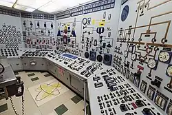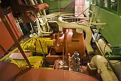 The main machinery room measures 55 feet (17 meters) long by 78 ft (24 m) wide and 32 ft (10 m) high. The main control room is immediately aft of the machinery room, from which engineers controlled both the reactor and the steam propulsion plant. A window separates the control room from the machinery room. The control room is visible from the viewing gallery on "C" Deck above. The steam plant is a relatively standard steam plant in its general characteristics, with a nine-stage high-pressure turbine and a 7-stage low-pressure turbine driving a single propeller shaft. The steam and water chemistry program was set up and managed by the Bull & Roberts Company to match the systems it provided for US Navy nuclear-powered aircraft carriers and submarines.[12] The turbines were specially adapted to use the saturated steam typically provided by a nuclear power source. It was also unusual in having a 750-horsepower (560-kilowatt) electric motor geared to the high-pressure turbine for use in an emergency. The motor was driven by either the ship's steam turbogenerators or the 750 kW emergency diesel generators located in the rear of the pilothouse. These generators could provide basic propulsion to the motor while running the reactor coolant pumps. The motor was upgraded to provide greater torque and reversibility to allow it to move the ship away from a pier in the event of a reactor accident.[10]
