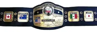The Domed Globe NWA World Heavyweight title featured the flag of the United States on its main plate, as well as those of Mexico, Canada, Australia, and Japan on its side plates.[32] The second side plate on the left side of the belt featured a modified version of the older Canadian Red Ensign rather than the official Canadian flag, the Maple Leaf, which had been adopted in 1965. The belt originally had a red suede/velvet strap along with a nameplate. The nameplate was only used once, by Jack Brisco, before it was removed from the design. The red leather strap was replaced with a black laced leather strap soon into Brisco's reign due to the material lacking durability. The original Domed Globe Belt was retired in 1986; Ric Flair retained possession of the original belt. It is currently located at WWE's Connecticut headquarters.[32] This design was revived in 1994 with a new belt that continues to represent the NWA World's Heavyweight Championship presently. In 2021, the NWA replaced the Australian flag side plate with a United Kingdom flag side plate, at the request of then-champion Nick Aldis. The Mexican-based lower weight classes Domed Globe championship belts featured the flag of Mexico on their main plates instead of the U.S. flag. From 1995 to 1997, the NWA World Junior Heavyweight Championship also had a Domed Globe design, as part of the J-Crown, with the U.S. flag in front; briefly during the 2010s, the NWA World Junior Heavyweight Championship once again had a Domed Globe design. During the mid-1990s, the NWA World Tag Team Championship was represented by Domed Globe belts, which were used during the NWA's partnership with IWA Japan. Numerous other championship belts have used the Domed Globe design, with some being NWA-sanctioned championships (such as the NWA Women's Pacific Championship) and others being unauthorized by the NWA (such as the FMW Brass Knuckles Heavyweight Championship).