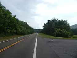 Between ASP Route 3 and exit 18 of the Southern Tier Expressway (I-86 and NY 17), NY 280 continues to straddle both the eastern extent of the Allegheny Reservoir and the western perimeter of Allegany State Park before terminating at a diamond interchange with the Southern Tier Expressway. The West Bank Perimeter Road (unsigned NY 950A[4]), which parallels NY 280 from the Pennsylvania line northward on the western bank of the reservoir, meets the expressway at exit 17 2.5 miles (4.0 km) to the west.[3]