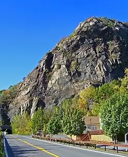 From Garrison, NY 9D heads through a 5-mile (8 km) stretch of lightly developed areas, intersecting County Route 11 (CR 11, named Snake Hill Road), another connector to US 9, and passing the Boscobel mansion on its way into the village of Cold Spring. The highway, now named Chestnut Street, heads generally westward to the center of the village, where NY 9D intersects Main Street, designated as NY 301 east of this point. On the opposite side of the intersection, NY 9D changes names to Morris Avenue for a half-mile (0.8 km) before exiting Cold Spring on a northwesterly track. Past the village line, the route parallels the Metro-North Railroad for 2 miles (3 km) through another portion of Hudson Highlands State Park. This section of the route, located mere yards from the river,[3] is locally known as the River Road, for its close proximity to the river, and The Flats, for its relatively consistent elevation.[5] The two-mile stretch leads to a tunnel through the Breakneck Ridge, which carries NY 9D across the Putnam–Dutchess county line.[3]
