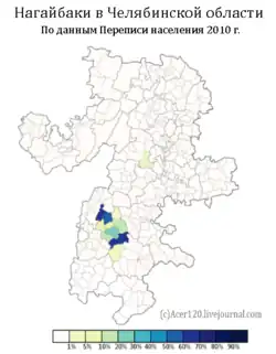 Nağaybäks[2] (/ˈnɑːɡaɪbæks/ NAH-gy-baks)[a] are an indigenous Turkic people in Russia recognized as a separate people under Russian legislation.[3] Most Nağaybäks live in the Nagaybaksky and Chebarkulsky Districts of the Chelyabinsk Oblast.[4] They speak a sub-dialect of the Tatar language's middle dialect known as the Nagaibak dialect.[4] Russian and Tatar historians usually treat the Nağaybäks as an integral part of Volga Tatars; a minority considers Nağaybäks a separate ethnicity in their own right.[4] In the 1989 Russian census, 11,200 people identified themselves as Nağaybäks,[4] falling to 9,600 in 2002.