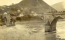 The Bridge on the Drina was written between July 1942 and December 1943.[18][c] A fifty-page outline of the novel has been preserved, as have Andrić's research notes.[18] In March 1945, it became the first title released by the newly founded state-owned publishing house Prosveta, as part of a series entitled Južnoslovenski pisci (South Slav Writers).[19] The first edition, numbering some 5,000 copies, was sold out by the end of that year.[20] It was one of three novels that Andrić published in 1945, the others being Travnik Chronicle (Serbo-Croatian: Travnička hronika) and The Lady from Sarajevo (Serbo-Croatian: Gospođica), in September and November 1945, respectively.[14] A total of five editions of The Bridge on the Drina were published over the next four years.[20] Andrić's works attained international recognition only after he was awarded the Nobel Prize, and were translated into dozens of languages thereafter.[21] The novel had been translated into English two years earlier by Lovett F. Edwards, in 1959.[22]