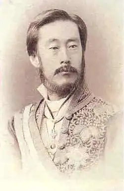 With the abolition of the han system, he surrendered his domain to the central government, and departed Japan with his two younger brothers for studies in Great Britain starting 1871.[1] He was appointed plenipotentiary minister to Rome in 1880, and returned to Japan in 1882. During his stay in England, he was appointed as official representative of Japan to the Court of St. James's by the Japanese government. After his return to Japan, he served in various political capacities, including president of the Genrōin, advisor to Emperor Meiji (and later Emperor Taishō), and as a member of the House of Peers. He was created marquis (侯爵, kōshaku) in the Peerage Act of July 7, 1884.[1] From 1911, he was president of Kokugakuin University.