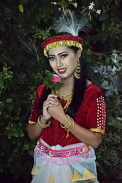 Nachom (Meitei: ꯅꯥꯆꯣꯝ, lit. 'ear sprout'), also known as nachomlei (ꯅꯥꯆꯣꯝꯂꯩ) or lei nachom (Meitei: ꯂꯩ ꯅꯥꯆꯣꯝ, lit. 'flower ear sprout'),[1][2][2]: 102 [2]: 178 is a traditional small bouquet or posy worn by Meitei women in Manipur, a state in Northeast India. It holds cultural, religious, and romantic significance in Meitei civilization and continues to be a part of rituals, festivals, and traditional attire.[3][4][5]