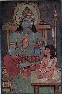 Vājashravas, desiring a gift from the gods, started an offering to donate all his possession. But Nachiketa, his son, noticed that Vājashravas was donating only the cows that were old, barren, blind, or lame;[7] not such as might buy the worshipper a place in heaven. Nachiketas, wanting the best for his father's rite, asked: "I too am yours, to which God will you offer me?" After being pestered thus, Vājashravas answered in a fit of anger, "I give you unto Yamaraja (god of death) Himself!"[8]