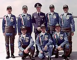After returning to Iran, Jahanbani formed Iran's first and only aerobatic team, the Golden Crown (Taje Talaii) in 1958 together with other officers, including Mohammad Amir Khatami, Amir Hossein Rabii, Siamak Jahanbini, and Abdolhossein Minusepehr, with the support of General Khatami and the Shah.[4] They started flying with F-84 Thunderjets and switched to F-86 Sabres. For the following twenty years, Golden Crown would symbolize Iran's military modernization under the Pahlavi government and set new standards for pilot skill, discipline, formation flying, precision, and teamwork - principles later reflected in the combat-ready IIAF culture during the Iran–Iraq war. Throughout the years, Golden Crown would give joint demonstrations and compete with teams of allied nations, including the USAF Skyblazers, the US Navy Blue Angels, Britain's Royal Air Force, French Air Force (Patrouille de France), and the Italian Air Force.[4][6][7]