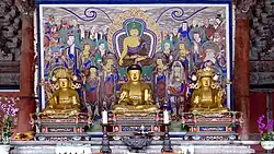 Daeungbojeon is the main sanctum (worship hall) at Naesosa where Sakyamuni Buddha in the center, Samantabhadra on the right, and Manjusri on the left are enshrined. This hall was built in 1633 at the time that Cheong-min rebuilt the temple. Constructed at the end of the Joseon Dynasty of wood only, Daeungbojeon uses no nails. Daeungbojeon consists of three front rooms and side rooms with an octagonal roof.