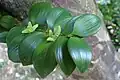 The leaves are simple and flat. The phyllotaxis or leaf arrangement can be spiral or subopposite and nearly decussate.[7][8] The leaf petioles are frequently twisted so the leaves form a flat plane around the shoot.[6][7] The leaf blade is elliptic, ovate-elliptic or lanceolate in shape.[6][7] Juvenile leaves are similar in shape to the adult leaves but may be larger or smaller depending on the species.[8] The leaves have multiple parallel longitudinal veins converging toward the ends. Stomata may be found on either both surfaces of the leaf or only the abaxial or underside. The leaf surface is coriaceous.[7]