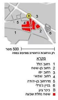 Map of Nachalat Shiv'a neighborhood: 1 Hillel Street, 2 Ben Sira St, 3 Jaffa St, 4 Shamai St, 5 Ben Yehuda St, 6 Generali Bldg at Zion Square