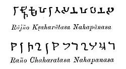 The Greco-Prakrit title "RANNIO KSAHARATA" ("ΡΑΝΝΙω ΞΑΗΑΡΑΤΑ(Ϲ)", Prakrit for "King Kshaharata" rendered in corrupted Greek letters) on the obverse of the coinage of Nahapana.[1][2]Nahapana Brahmi and Kharoshthi legends on his coinage "RAJNO KSHAHARATASA NAHAPANASA "Of the Rajah Nahapana, the Kshaharata".[3][4]