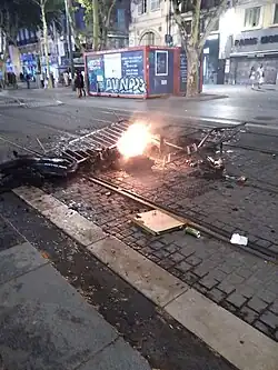 Riots were reported in the evening of 27 June after videos of Merzouk's killing in Nanterre began to circulate. The urban unrest was concentrated in Nanterre, where rioters threw projectiles at police, let off fireworks, and set cars, bus shelters, rubbish bins, and a school on fire. Fires were also lit near the tracks of the RER A.[42] This rioting lasted until morning in Nanterre and spread to other areas in Île-de-France, but was also reported in Colmar and Roubaix. By the end of the day, there were at least 20 police officers injured, 10 police cars damaged, and 31 arrested.[43] 2,000 police officers and gendarmes were deployed to deal with the outbreak of violence.[44]