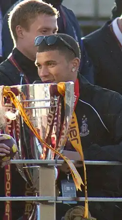 Wells scored a penalty on the opening day of the 2012–13 season in an away match against Gillingham.[42] He scored his second goal of the season on 25 August in a 5–1 win against AFC Wimbledon, and also assisted the fifth goal, crossing for James Hanson to score with a header.[43] In September 2012, Wells suffered a hip injury.[44] On 25 September, Wells came off the bench to score two late goals to help Bradford overturn a 2–0 deficit against Burton Albion in the League Cup third round, with Bradford going on to win the game 3–2 in extra time.[45] At the end of September 2012, Wells signed a new three-year contract with the club,[46][47] in a move praised by Phil Parkinson, the club's manager.[48] In October 2012, Wells was banned by the club from celebrating his goals.[49] As the January 2013 transfer window opened, Bradford City dismissed rumours linking Wells with a move away from the club.[50] On 8 January 2013, he helped Bradford beat Premier League side Aston Villa 3–1 in the first leg of the semi-final of the League Cup by opening the scoring in the 19th minute.[51] After appearing in the 2013 League Cup Final, Wells became the first player from Bermuda to appear in an English major cup final.[10] Although Wells did not complete the game,[52] prior to the match he spoke about being motivated by the recent death of a friend in a motorcycle accident,[53] as well as how he was looking forward to facing opponents from a higher league.[54] Wells hadn't scored for the club since 2 February 2013,[55] until he scored the only goal of the game on 6 April 2013, in a 1–0 home victory against Northampton Town.[56] Later that month, he was linked with a transfer to Burnley.[57]
