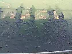 The fishes found in the lake are generally carps: species of mahseer,[a] hill trout, and the mirror carp which breed several times during one spawning season during May to September. Two species of mahaseer fish are present: Tor tor, the red-finned mahseer, and Tor putitora the yellow-finned mahseer, a food fish which grows to varying sizes from 20 to 60 cm (8 to 23.5 in) are reported. The three species of hill trout found in the lake are Schizothorax sinuatus, S. richardsoni and S. plagiostornus. The imported fish bred in the lake is mirror carp, a variety of the common carp Cyprinus carpio.[5] The mosquitofish Gambusia affinis has been introduced in the lake for the biocontrol of mosquito larvae.[5]