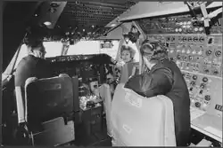 (L to R) Secretary of Transportation John Volpe, First Lady of the United States Pat Nixon, and Najeeb Halaby (Pan-Am Corporation) in the cockpit of Pan Am Boeing 747 N735PA, Clipper Young America, at the christening ceremony for the plane, 1970