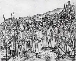 An uprising against communist rule in Dagestan began on 11 May 1920, with a group of North Caucasian political figures gathering in the village of Vedeno and declaring the restoration of the monarchy of Imam Shamil. Muhammad Karim, Shamil's son, was first selected as monarch, but he refused on account of his health, instead sending his 19 year-old son Said.[53] Najmuddin returned to Dagestan ahead of Said, leading an uprising in the Avar District in September 1920.[54] The uprising soon spread across Dagestan, growing to include the Andi and Gunib districts. Both Gunib and Khunzakh, strategically-important villages held by the Bolsheviks, were also captured.[4] At the Battle of Arakani Gorge, the rebels were able to inflict massive casualties on the Red Army.[55]