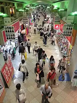 Today, Nakano Broadway remains a major destination for both domestic otaku and otaku tourists in Japan, catering to a niche clientele relative to mainstream otaku destinations in Akihabara and Ikebukuro.[3][4] The physical design of the mall remains largely unchanged from its original 1966 construction and is often cited as an example of Shōwa era architecture.[4] The mall was designated an at-risk building for earthquakes of a magnitude of 6.0 or greater by the Tokyo Metropolitan Government in March 2018, as the building was constructed prior to the implementation of contemporary seismic standards in 1981 and has not subsequently been retrofitted to be earthquake-resistant.[5]