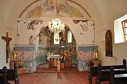 The local church is dedicated to Saint James and belongs to the Parish of Črnomelj. It is a single-naved medieval building with a Gothic sanctuary covered in wall paintings dating to 1470 depicting scenes from the Passion of Christ.[4]