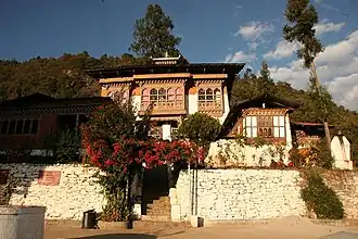 One of Shakya Rinchen Rinpoche's main disciples built the original lower temple (Sonam Ghatsel temple) but it was destroyed by fire. It was rebuilt in the 1960s, during the Fourth King's (Jigme Singye Wangchuck) reign, with the support of the Queen Great Grandmother Ashi Kesang Choden Wangchuk.