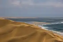 The source of the unconsolidated sand (the most recent sand sea) is dominantly from the Orange River, which drains into the Atlantic south of the Namib Sand Sea, with minor contributions in the east from the (now ephemeral) rivers that drain into the sand sea.[10] For this reason, the Namib Sand Sea has been referred to as the "wind displaced delta of the Orange River."[10]