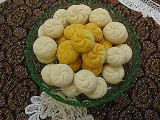 Nan-e berenji (Persian: نان برنجی), or Nan-berenji (نانبرنجی), also called shirini-e berenji (شیرینی برنجی), is an Iranian rice-flour cookie originating from Kermanshah.[1] Nan-e berenji literally translates to "rice bread". It is often flavored with cardamom, garnished with poppy seeds and formed into flat disks. They are usually white, but sometimes tinted yellow.[2]