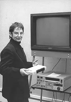 In 1975 she and Richard Hefti married and she took on Dutch citizenship.[1] In 1976 she made the acquaintance of Wies Smals, who opened the first multimedia space de Appel in Amsterdam. This alternative space rapidly became a lively centre of artistic exchange and provided Hoover with an invaluable support system.[10] A measure of the international recognition of Hoover's art occurred in 1977 when she participated in the documenta 6 in Kassel and had screenings of her videotapes at the Museum of Modern Art in New York City. She made her first colour videotape in 1978, "Impressions" (1978, colour, sound, 9'45"). While it is a performance of the hand interacting with and at times intercepting a light beam, it also seems at one point to visualize "writing with light", when the end of her index finger is positioned on the light beam.