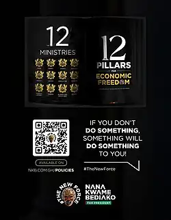 In early 2024, Bediako launched a policy framework titled "The 12 Pillars for Economic Freedom", which he presented virtually—reportedly the first such launch of its kind in Ghana. The framework focused on areas such as infrastructure, agriculture, job creation, and governance reforms. According to statements from Bediako and the New Force, the policy was informed by research into Ghana's mineral resources and agricultural potential, which they claimed could generate significant economic returns and employment opportunities.[51] The launch included symbolic gestures, such as Bediako arriving on stage in a truck to signify his intent to work for the people. The New Force claimed that some elements of the 12 Pillars were later echoed by other political leaders across Africa. These claims have not been independently confirmed in reliable sources and remain attributed to the movement itself.[52]