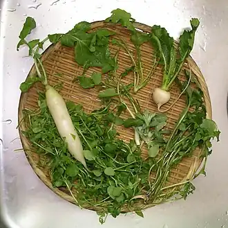 The nanakusa (七草/七種), or more specifically, haru no nanakusa (春の七草/春の七種), spring's seven flowers (or herbs), are seven edible wild herbs of spring. Traditionally, they are: