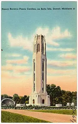 The Nancy Brown Peace Carillon is a bell tower containing an electronic carillon on Detroit's Belle Isle. It is dedicated to peace and named after Nancy Brown, the pseudonym of The Detroit News columnist Mrs. J. E. Leslie (born Annie Louise Brown).[1][2] Brown began writing for the newspaper in 1919, held her first religious "Sunrise Service" (drawing approximately 50,000 people) on Belle Isle in 1934, and began a campaign to raise money to build a peace carillon on the island in 1936.[2][3][4] Brown herself broke the ground for the carillon on October 30, 1939, and its cornerstone was laid on December 13 of that year.[2][5] A notable backer of the project was John C. Lodge, a former mayor of Detroit and a member of the Detroit Common Council.[2]