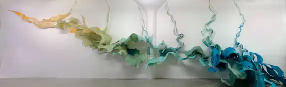 Beginning in the latter 2000s, Cohen shifted to handmade paper works, multi-part installations and glass sculptures inspired by the shifting marsh ecology of the New Jersey/New York river system.[5][23] Her exhibition "Water Ways" (Noyes Museum, 2008) was anchored by her most ambitious work up to that point, Estuary: Moods and Modes. An imposing, undulating installation of layered, handmade and hand-colored Abacá pulp—some stretched like parchment skins over wire armatures—it referenced a biotic ecosystem of the Mullica River that she had observed for months.[2][9] Sculpture critic Dominique Nahas described the work as simultaneously bas-relief, walk-around sculpture, installation and diagrammatic drawing in space, with "delicately colored, nearly translucent, swirling and trailing papers evoking the fragile balance and power of nature," various flows, and shifting topography and weather.[2]