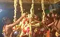 In Thirumazhapadi, Vaidyanathasamy and His consort welcome the group of bridegroom to the accompaniment of music. Then they will be taken to the specially erected wedding mandapa.[5] The marriage festival is held in front of the devotees. After completion of the festival deeparadhana would be done. Later the celestial couples offer blessings. [6] The priests of the temple perform the marriage of Nandhi. As per the marriage ritual the couple would go around the ceremonial fire seven times. Shiva took the newly wed couple to seven Shiva temples around Thiruvaiyaru.[1] These seven temples are known as Saptha Sthanams. They are very close to each other and can be covered in one session. In the tamil month of Chittirai (April-May), the Deity (Utsavar) of Thiruvaiyaru is carried on a palanquin to all these temples.[7]