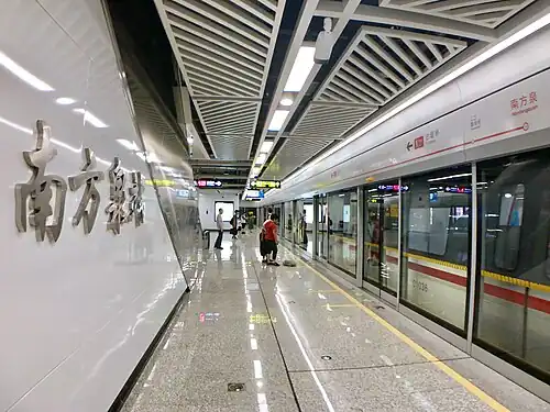 Nanfangquan station is the terminal station of Line 1. It is a standard island platform with two underground floors.[3] The station exits Gedaiqiao station, goes south through the Xidahe Green Belt, and ends at a station on Nanhu Road. After arriving at the station, the train returns via a switchback line.[2]