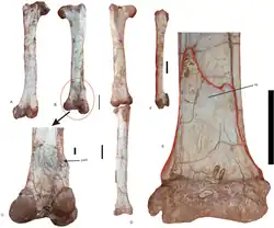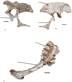 The femur and tibia of Nankangia are approximately the same length. Its femoral neck extends dorsomedially at about 90° to the shaft. It has relatively small ratio of height to length of ilium (0.36), which is additionally shorter than the femur as seen in Yulong and Khaan. The ilium of Nankangia is uniquely shaped, and among oviraptorosaurians, resembles the ilia of Chirostenotes, Rinchenia, Heyuannia and Shixinggia, and clearly differs from the ilium of Luoyanggia. Due to the lack of well-preserved corresponding elements between the specimens of Nankangia and Wulatelong, from the Wulansuhai Formation of Inner Mongolia, Lü et al. (2013) could not differentiated between them.[1]