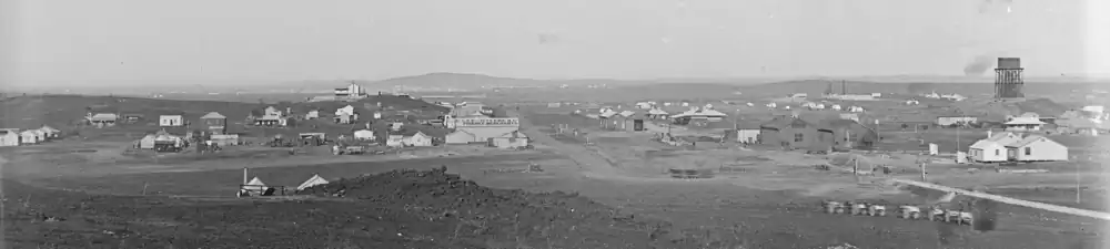 Nannine is an Aboriginal name, "Nannine Wells" being first recorded by a surveyor in 1889. The meaning of the name is 'fat', used of a place in the indigenous landscape where the primordial Dingo of the dreaming bit off part of an Emu, leaving a trace of the act in a local cliff-face, which the Aboriginal people called 'nganiny'.[5] The earliest days of gold discovery at this site are shrouded in controversy, but according to one source it is likely that the first suspicions of gold in the area were apparently held by Ingpen and Watts, station hands on the Annean pastoral station. In about May 1890 they showed the site to J. F. Connolly, a New South Wales mining engineer, who found gold but he does not appear to have been too impressed. In October 1890 McPherson and Peterkin were directed to the same site and found significant quantities of gold. By August 1891 they and others had recovered about 53 kilograms (1,700 ozt) of gold. The Murchison Goldfield, which included Nannine was proclaimed in September 1891. By December about seven hundred men were at the field.[6]